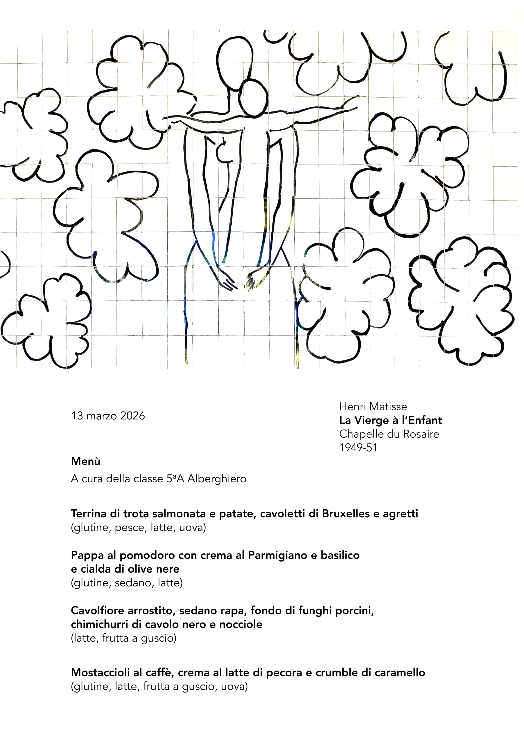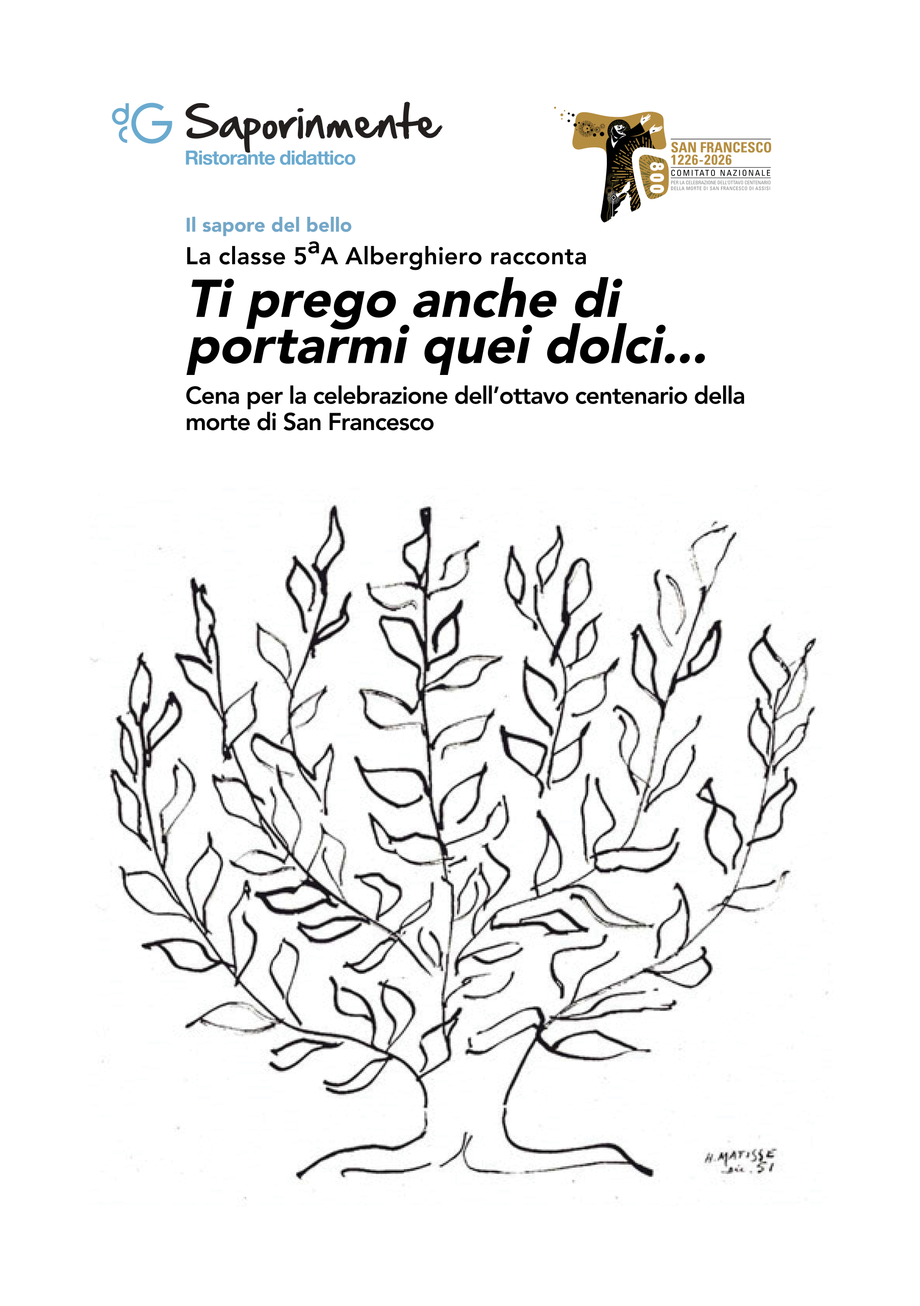 Un pesce d’acqua dolce, gli agretti di questa stagione, il fiore del cavolo. E, ovviamente, come dolce congedo, quei Mostaccioli di donna Jacopa da mangiare insieme a tutti i commensali. Si sa che San Francesco non riuscì a mangiarli, perché troppo duri ormai per i suoi denti, ma volle che tutti i frati, con Jacopa, ne mangiassero intorno a lui, come a una festa.